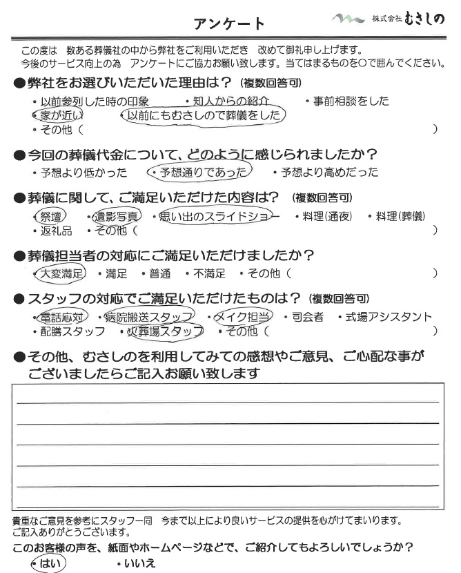 父の亡くなった時、突然のことで何をどうしてよいかと不安でなんとか過ごせたのも、むさしののスタッフの皆様のサポートがあってのことでした。それから、知人などいろいろな方のご葬儀に参列させて頂きながら、今回本人の希望により家族葬は初めてのことでしたけれど、とても前回より不安に思わず執り行うことができてよかったと思っております。途中お寺のトラブルなどいろいろありましたけれど、お助け頂きました。担当者様、司会者様、他スタッフの皆様に感謝申し上げます。これからも残る家族のためにお力ぞえいただけたらと思います。ありがとうございました。
